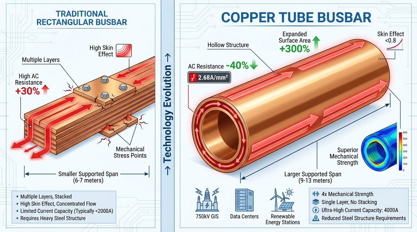 Ta rewolucja strukturalna bezpośrednio rozwiązuje problemy związane z transmisją ultrawysokiego prądu. W rozdzielnicy w izolacji gazowej (GIS) 750 kV szyna zbiorcza z rurki miedzianej Φ100 × 5 mm może przewodzić prąd o natężeniu 4000 A przy gęstości prądu wynoszącej zaledwie 2,68 A/mm². Natomiast równoważne szyny prostokątne wymagają wiele ułożonych warstw , co prowadzi do wzrostu strat o ponad 30%. Co ważniejsze, wytrzymałość mechaniczna szyn zbiorczych z rur miedzianych jest czterokrotnie większa niż w przypadku szyn prostokątnych. Pod wpływem prądu zwarciowego o natężeniu 50 kA rozpiętość podwieszana sięga 9 metrów, a rozpiętość podparta rozciąga się do 13 metrów, co znacznie zmniejsza zapotrzebowanie na konstrukcje stalowe podstacji.