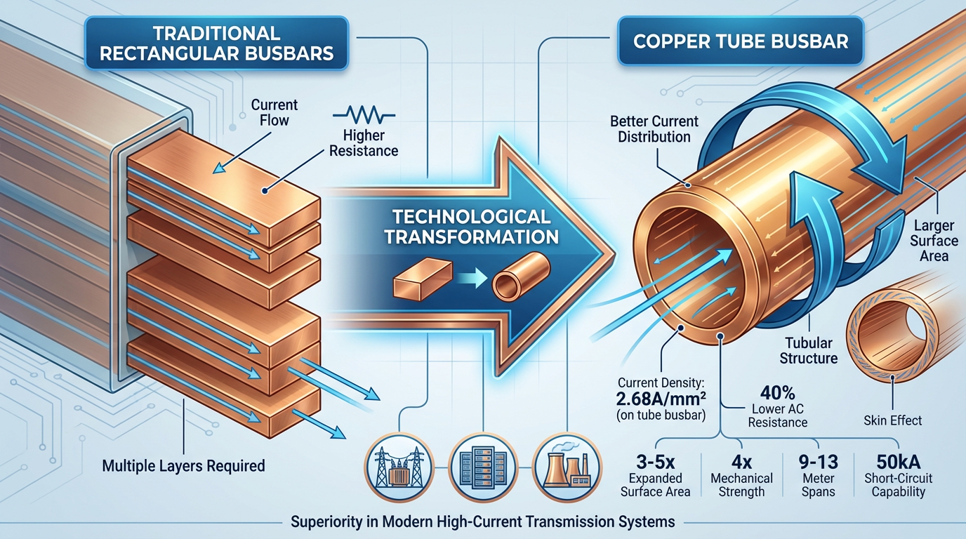 Modernizacja globalnej infrastruktury energetycznej napędza bezprecedensowy popyt na energię rurka miedziana szyny zbiorcze. Produkty te stanowią zaledwie 2–3% całkowitego zapotrzebowania na rury miedziane, a ich tempo wzrostu przekracza 200% rocznie w zastosowaniach takich jak podstacje ultrawysokiego napięcia, centra danych i nowe elektrownie. Podstawową zaletą jest ich pusta rurowa konstrukcja , który zwiększa powierzchnię przewodu 3-5 razy, zapewnia równomierny rozkład prądu wzdłuż ścianki rury, zmniejsza współczynnik efektu naskórkowości poniżej 0,8 i zmniejsza rezystancję prądu przemiennego o 40% w porównaniu do szyn prostokątnych o równoważnym polu przekroju poprzecznego.