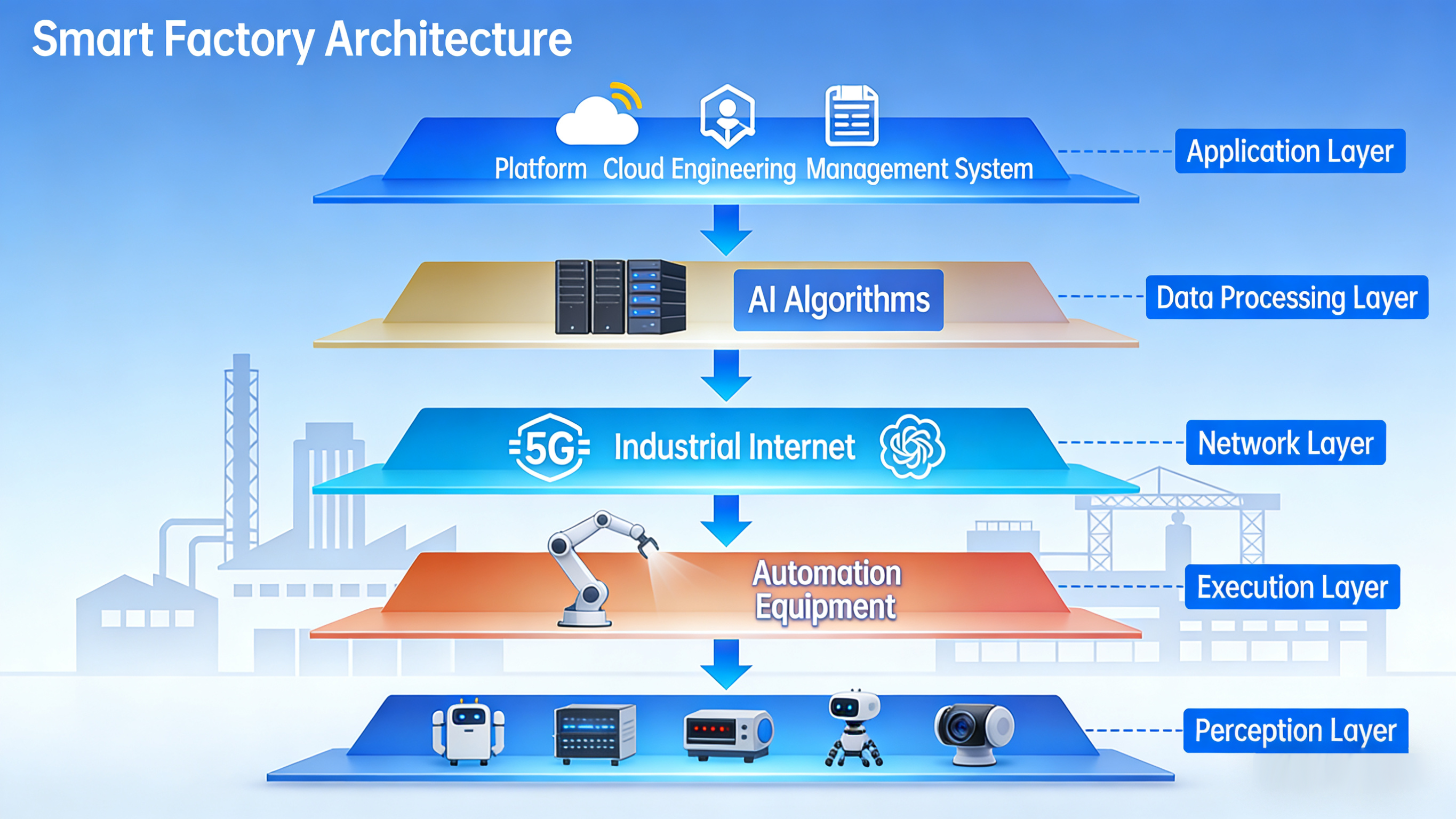 Rysunek: Architektura inteligentnej fabryki zazwyczaj obejmuje warstwy percepcji, sieci, przetwarzania danych, wykonywania i aplikacji, umożliwiając przepływ danych z czujników do platform chmurowych.
