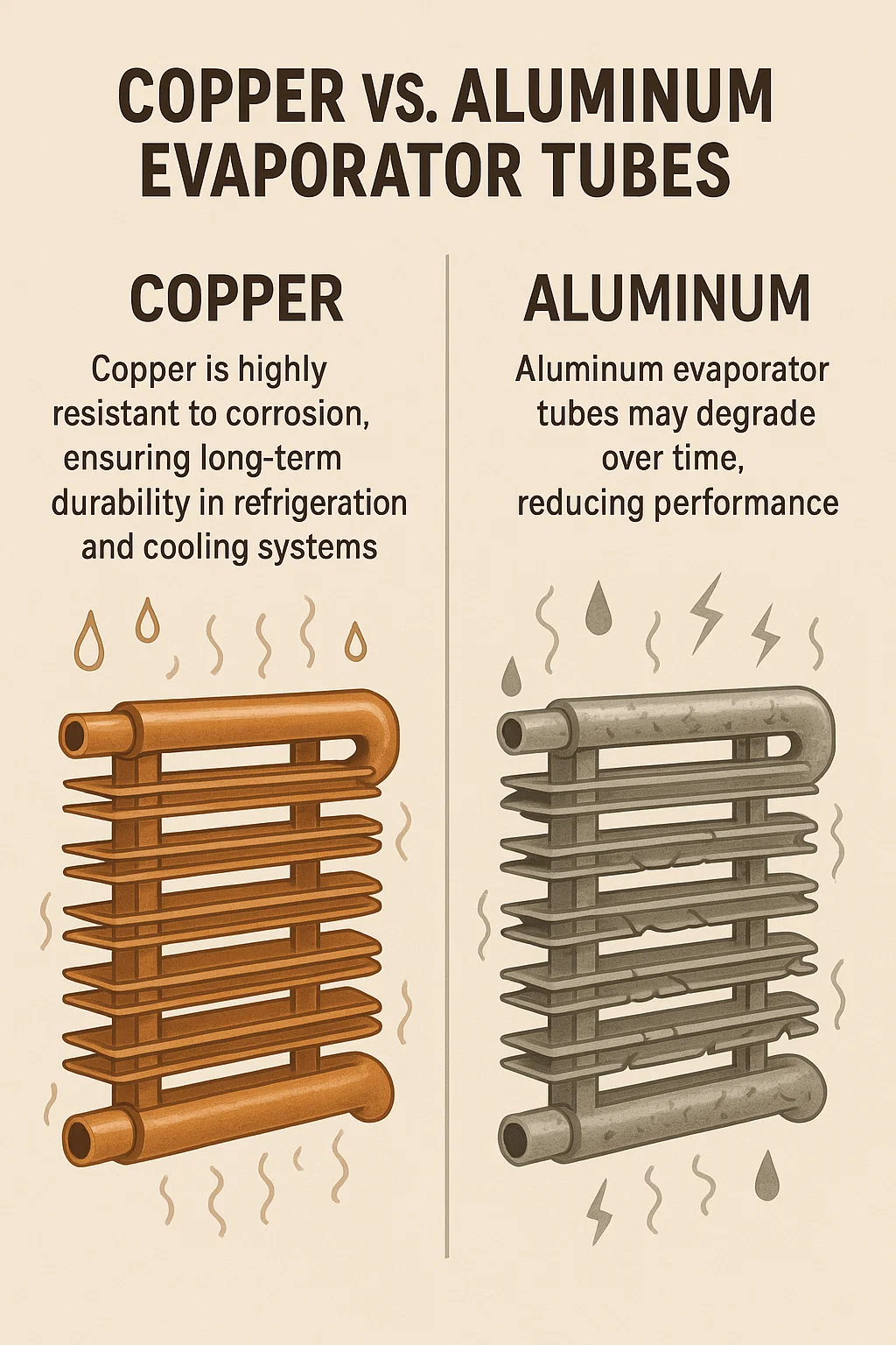 | Charakterystyczny | Miedź Evaporator Tubes | Aluminium Evaporator Tubes |