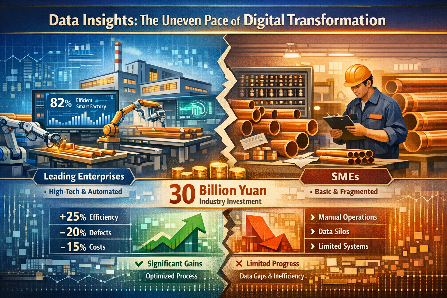 "Wydaliśmy ponad 8 milionów juanów na system ERP i platformę monitorowania produkcji, ale ostatecznie przenieśliśmy nasze księgi w formie papierowej do Internetu. Wydajność produkcji nie poprawiła się zbytnio, a nawet zwiększyła obciążenie pracą naszych pracowników. " Pan Wang, głowa średniej wielkości rurka miedziana z prowincji Henan, wyraził powszechny dylemat, przed jakim staje branża w procesie transformacji cyfrowej. Kierując się inicjatywą „Made in China 2025” i falą Przemysłu 4.0, przemysł rur miedzianych odnotował gwałtowny wzrost wysiłków w zakresie transformacji cyfrowej, a firmy, od wiodących przedsiębiorstw po małych i średnich producentów, intensywnie inwestują w inteligentny sprzęt i systemy cyfrowe. Rzeczywistość jest jednak taka, że większość firm jest uwięziona w cyklu „dużych inwestycji, małych zysków”, a cyfryzacja pozostaje powierzchowna; tylko kilka firm osiągnęło głębokie wzmocnienie pozycji, wykorzystując cyfryzację do połączenia całego łańcucha produkcji, łańcucha dostaw i obsługi klienta, co skutkuje redukcją kosztów i poprawą wydajności. Z jednej strony mamy do czynienia z formalizmem „cyfryzacji dla samej cyfryzacji”, z drugiej zaś – efektywną transformacją „napędzania tworzenia wartości poprzez cyfryzację”. Dlaczego istnieje taka polaryzacja w cyfrowej transformacji branży rur miedzianych? Za tym kryje się złożona interakcja błędów poznawczych, adaptacji technologicznej, wsparcia talentów i planowania strategicznego, która dotyczy również głównej siły napędowej wysokiej jakości rozwoju branży.