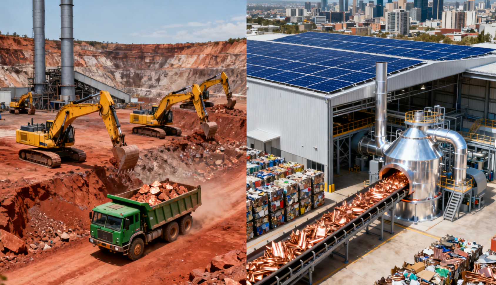 (Podpis: Podstawowa dychotomia: wydobycie zasobów (gospodarka liniowa) kontra regeneracja zasobów (gospodarka o obiegu zamkniętym) reprezentują przeciwstawne wizje przyszłości produkcji rur miedzianych.)