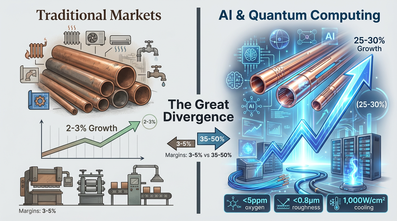 Globalny rurka miedziana branża doświadcza bezprecedensowego rozdrobnienia. Podczas tradycyjna konstrukcja i Aplikacje HVAC rosnąć w umiarkowanym tempie 2-3% rocznie, popyt na precyzyjne rurki w produkcji półprzewodników, infrastrukturze sztucznej inteligencji i obliczeniach kwantowych rośnie o 25–30% rocznie. Ta rozbieżność tworzy dwupoziomowy rynek: producenci masowi borykają się z marżą na poziomie 3–5%, podczas gdy producenci wyspecjalizowani osiągają marżę brutto na poziomie 35–50% w przypadku rur spełniających ekstremalne specyfikacje.