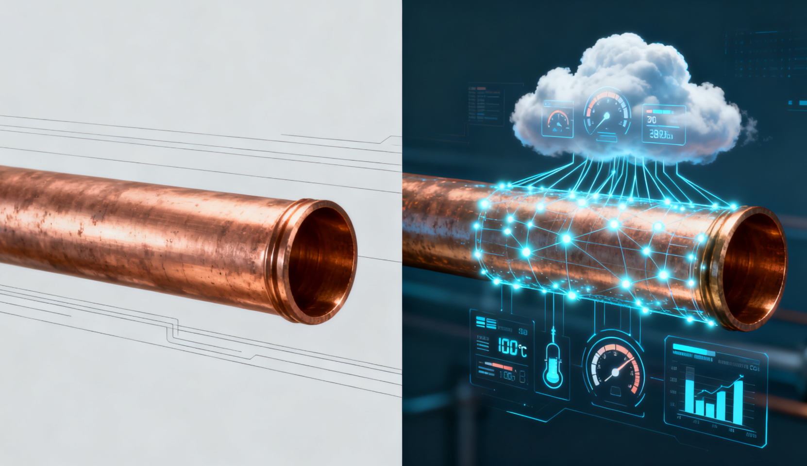 Podpis: Metamorfoza tożsamości: od cichej rury po lewej stronie do „mówiącego” węzła danych po prawej stronie, technologia cyfrowa definiuje na nowo wartość rur miedzianych.