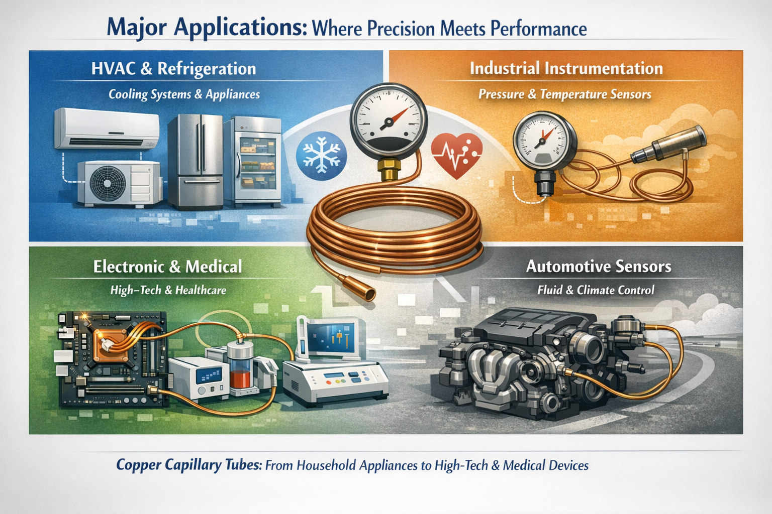 Ze względu na zdolność kontrolowania przepływu płynu z niezwykłą dokładnością, miedziane rurki kapilarne można znaleźć we wszystkim, od urządzeń gospodarstwa domowego po sprzęt medyczny ratujący życie.
