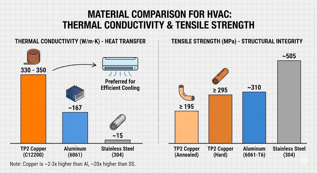 Miedź TP2 można łatwo zginać, rozciągać lub „zaginać” bez specjalistycznych ciężkich maszyn. Ta elastyczność jest niezbędna przy instalowaniu przewodów czynnika chłodniczego w ciasnych przestrzeniach lub tworzeniu skomplikowanych wężownic parownika.