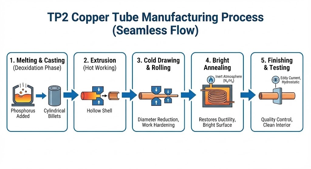 Produkcja rur miedzianych TP2 to podróż od wytapiania w wysokiej temperaturze do precyzyjnej obróbki na zimno. Większość lamp premium TP2 jest produkowana jako bezszwowe rurki , co eliminuje ryzyko uszkodzenia szwu spawalniczego.