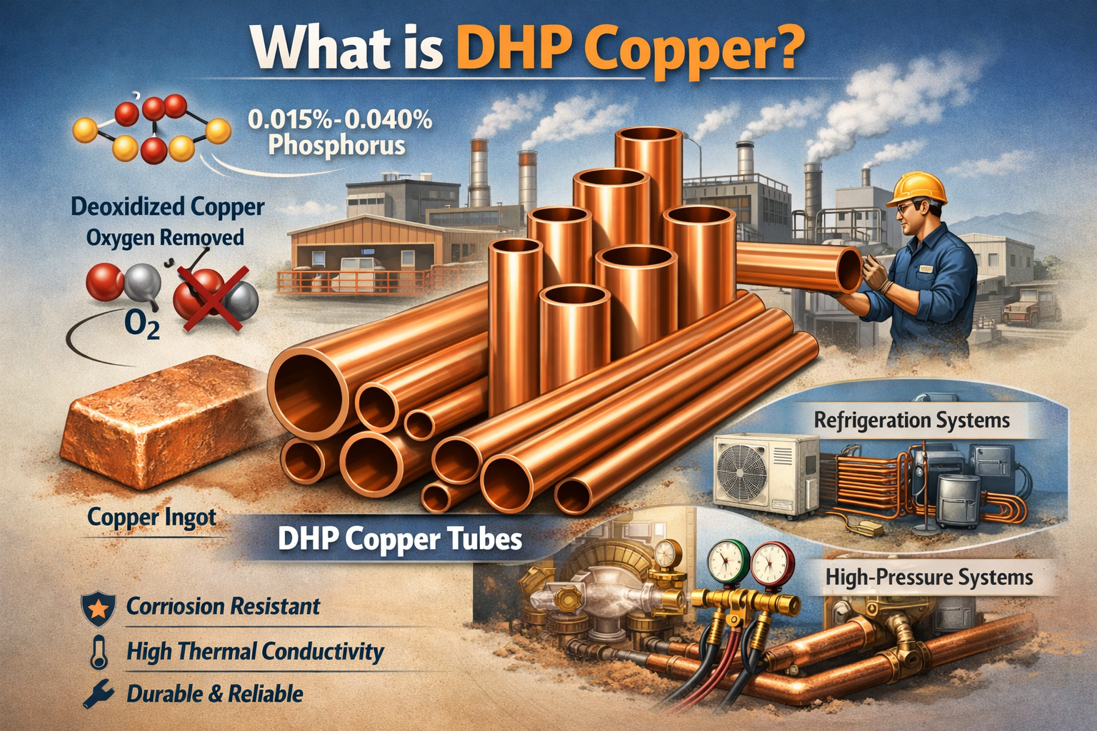 Miedź DHP jest wysokiej jakości, odtleniona miedź przestań kontrolować ilość fosfor , zwykle od 0,015% do 0,040%. Podstawową funkcją tej miedzi jest to, że została ona poddana obróbce w celu zniszczenia, co zapewnia jej działanie na wyłączniku i zapewnia doskonałe działanie w układach wysokociśnieniowych. Zawiera dodatkowe zalety jego funkcji, dzięki czemu nadaje się do zastosowań, w których występuje, przewodność cieplna i znaczenie kluczowe.