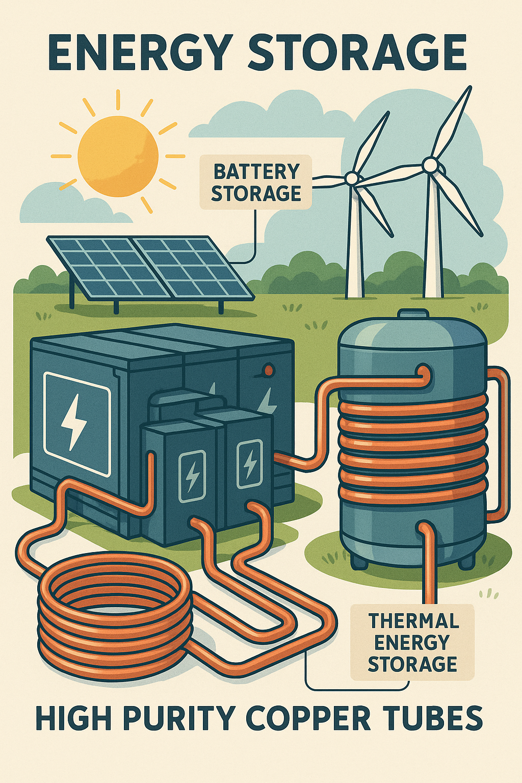 Magazynowanie energii jest kluczowym elementem infrastruktury energii odnawialnej, pomagającym zrównoważyć nieciągły charakter źródeł takich jak energia słoneczna i wiatrowa. Rury miedziane o wysokiej czystości stosowane są w różnych systemach magazynowania energii, m.in baterie i systemy magazynowania ciepła . Systemy te wymagają komponentów, które mogą efektywnie zarządzać ciepłem i energią elektryczną, aby zapewnić niezawodne działanie.